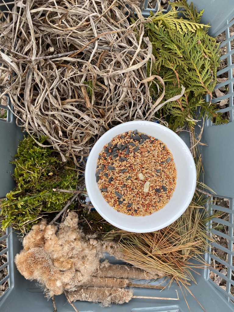 After we had our idea, I consulted the internet. All sources on safe nesting material seem to agree that you should not leave out yarn or string or dyer lint or human hair. These are not safe, as birds can become tangled in the long strands. Well… that made me feel pretty guilty for snipping off the piñata string and letting the bird take it away. The materials birds really need are the ones they would find in the natural world: