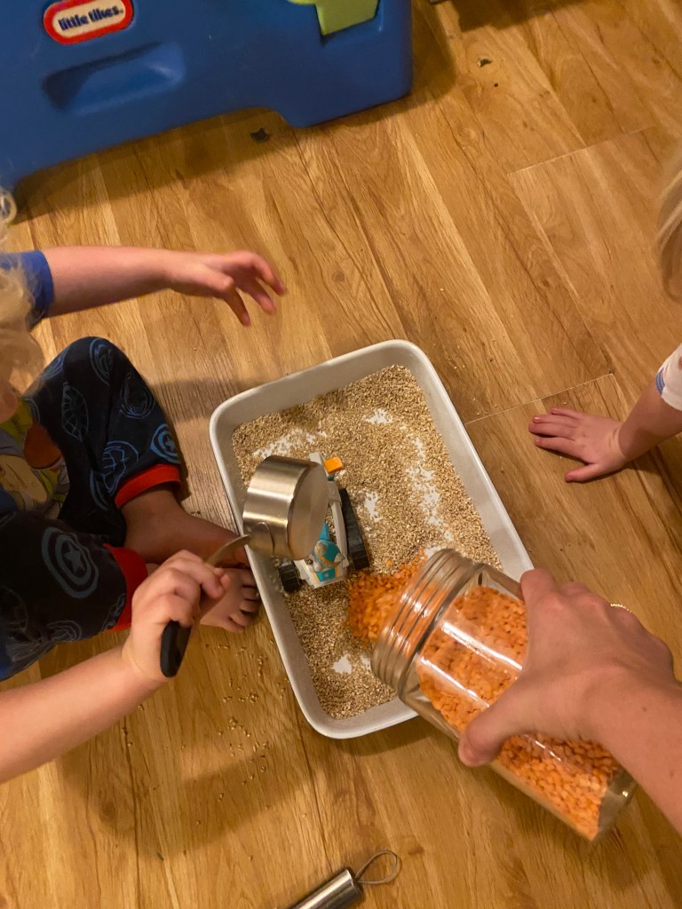 - When they start to get bored, pour in something else. I like using red lentils to add colour.