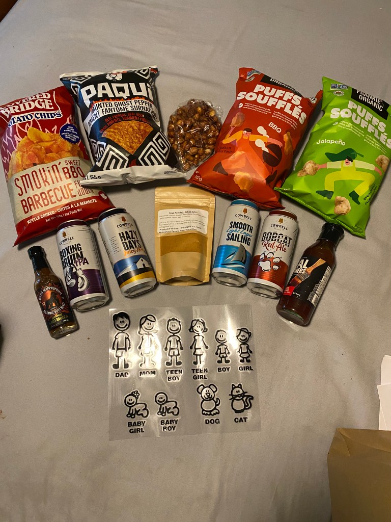 - A Delicious Snack – We like getting something very unusual, that takes manliness to eat! Like lobster-flavoured chips. This time I did two spicy snacks and two barbecue-flavoured snacks. Also some beer nuts.
