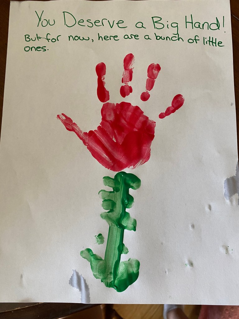 - Hand Print Art with Pun – Turn painted hand prints into flowers, or a guitar, or a “family tree.” Then add something like, “Gotta hand it to you!” or “You deserve a big hand!” or “You can handle anything!” I have even seen a hand outline cut out and glued into the “rock on” symbol, with the words, “You Rock!”