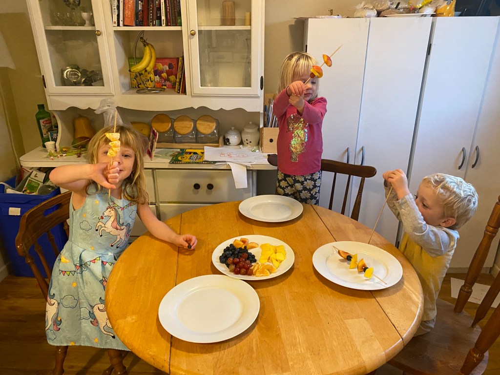 - Give each kid a shish kabob skewer