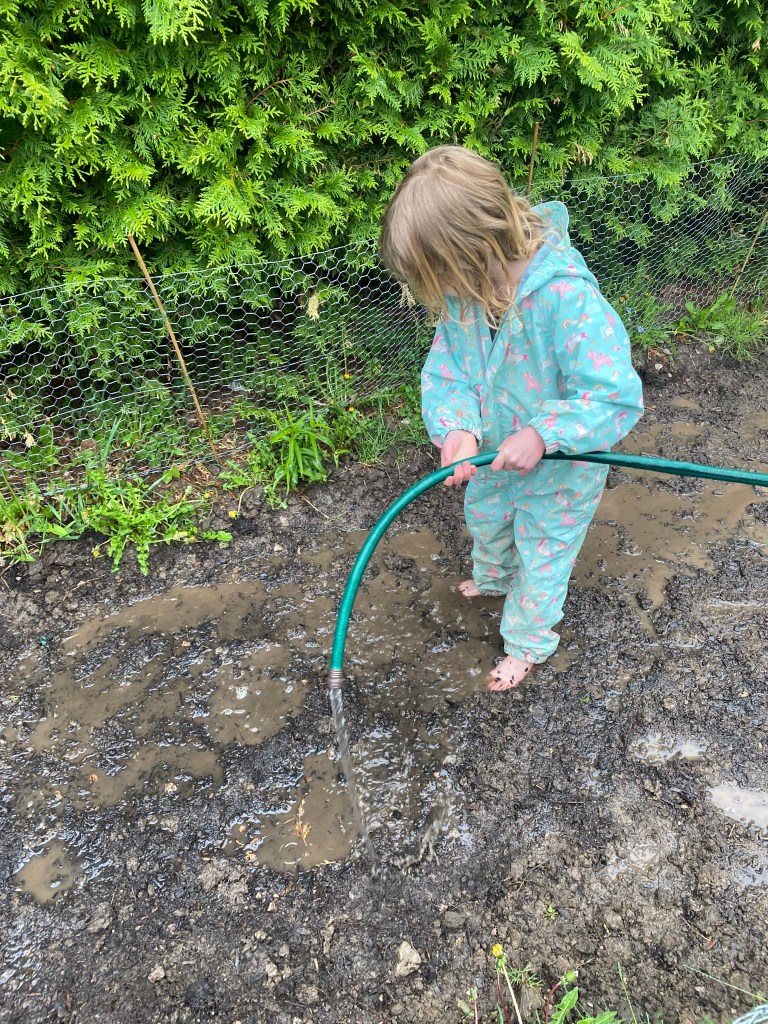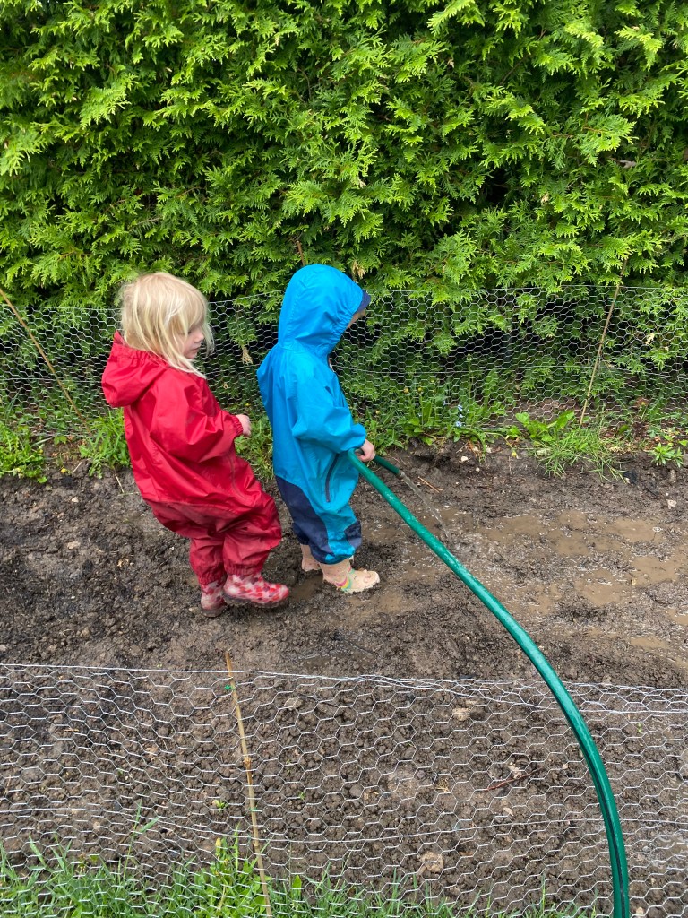 When you’re a kid, being allowed to get dirty is such an exhilarating experience. It feels like you shouldn’t be allowed to, but somehow you are! I remember when my mom let me soak the dirt in one of her giant flower pots, and then get in and stomp around. No one talked about “sensory play” back then. I just knew I loved the “suck, squish” as I stomped and that it felt like I got a free pass to break the rules. So each spring, before I plant the gardens, I let the kids soak the soil and stomp around, making their own mud pit. It didn’t work quite as well this year, as it was quite cold outside the day before planting, which decreased the fun of squishing mud with bare feet. However, making the mud pit itself was still enjoyed by… whichever kid got to hold the hose at any given moment. It did end up pressing down the soil a bit, so maybe best to do before you till the soil for planting.