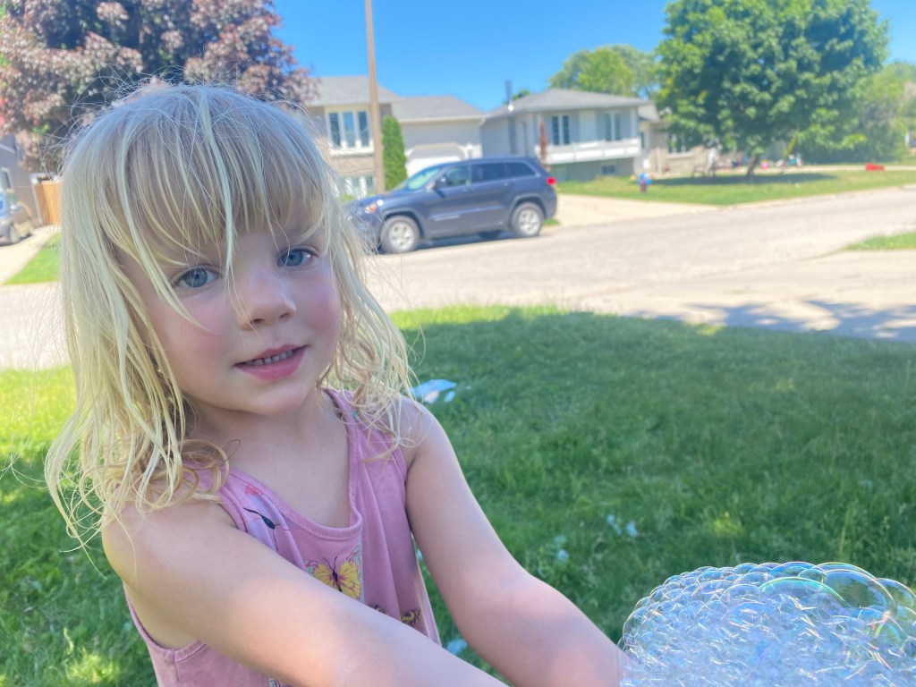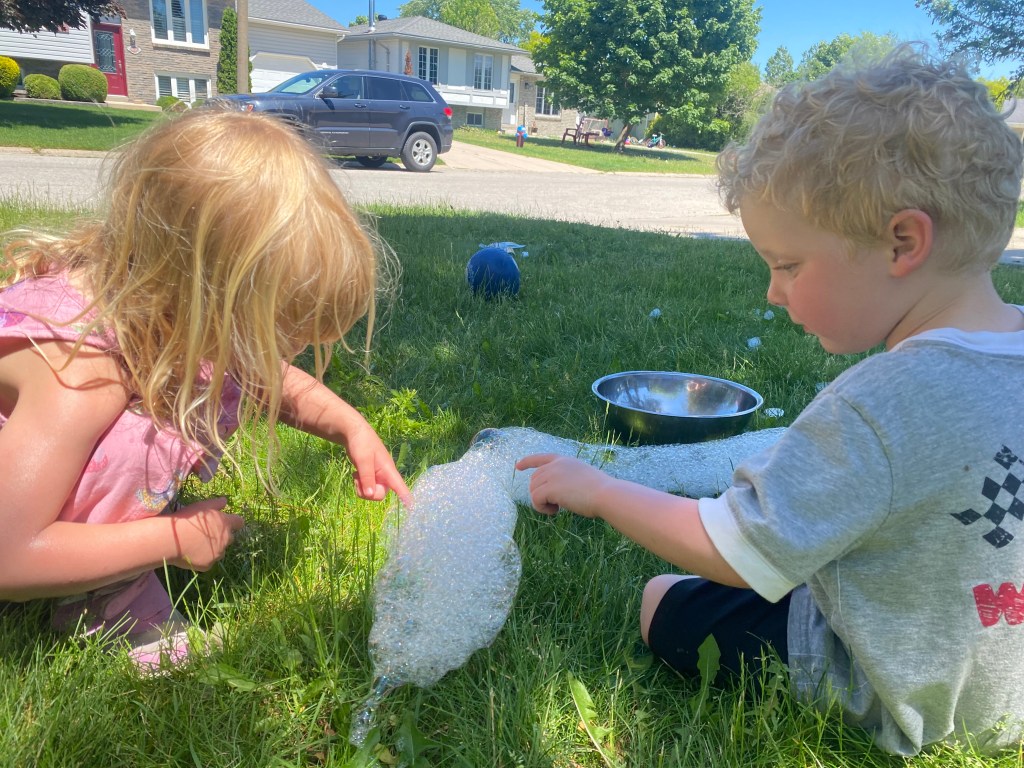 You can make bubble snakes, bubble piles or bubble handfuls. You can poke at bubbles, stomp on bubbles, and apparently try to give them to your dog. The bubbles stayed around for a while instead of popping and sparkled in the sun, like a faceted diamond. Both children had an easy time using the blower and went back to use it again and again.