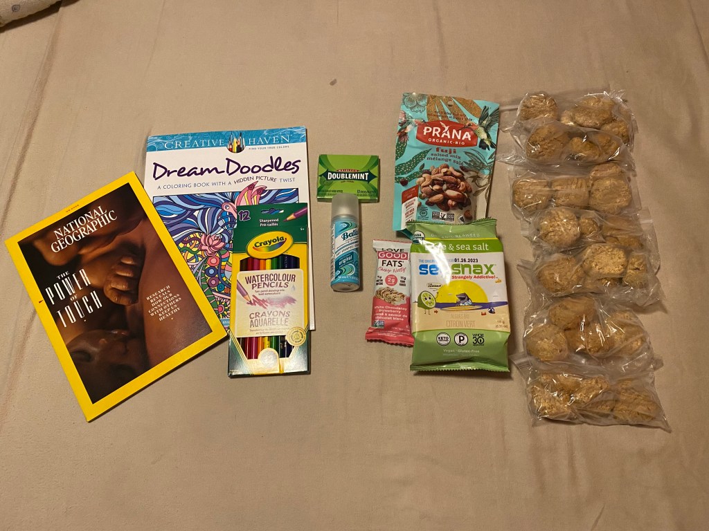 This care package was a team effort for a friend who has been visiting a relative in the hospital. I think this package could work equally well for someone who was a hospital patient.