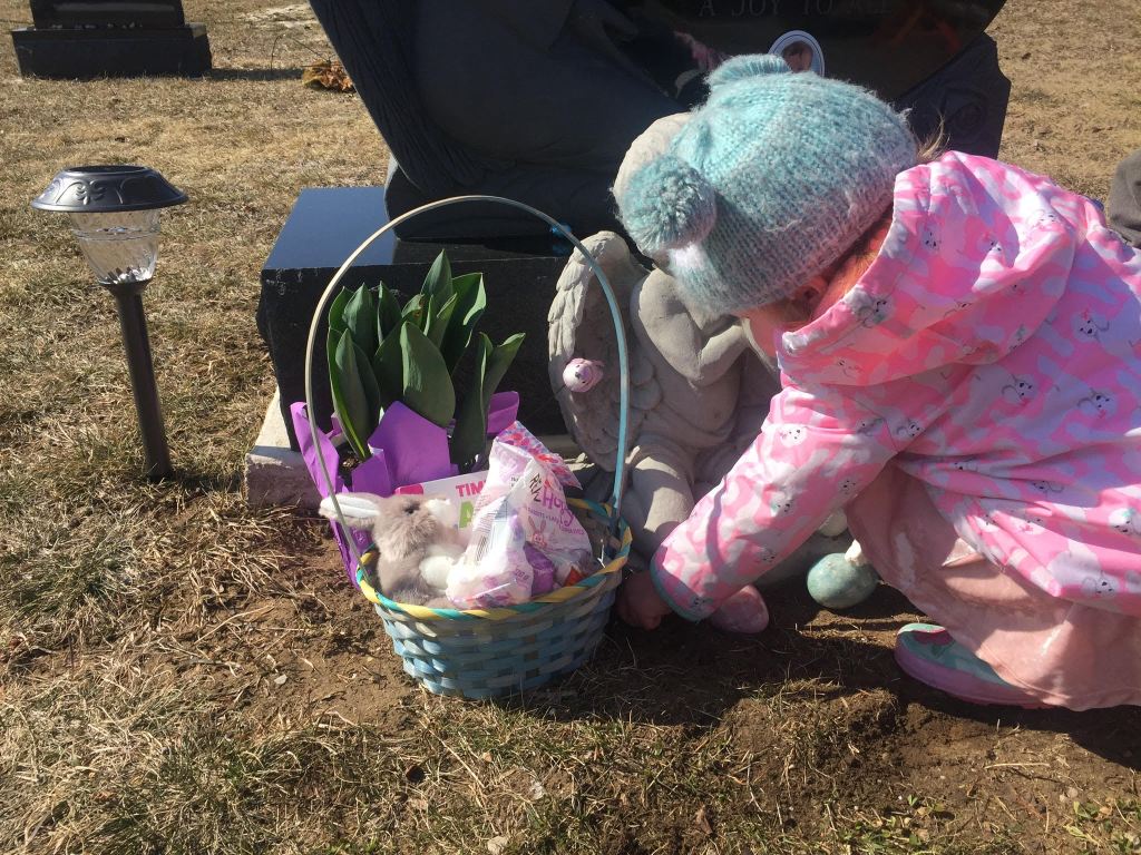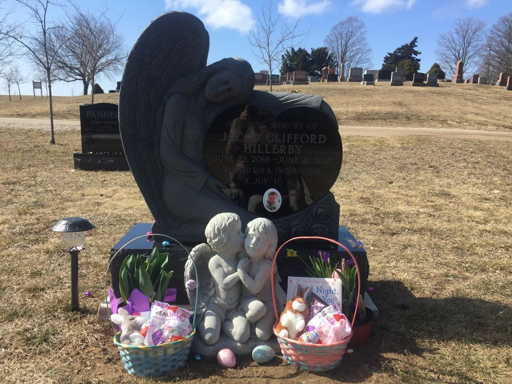 Our first two Easter egg hunts were at the cemetery. After we had more children, we moved it to our basement to reduce the effort with babies and toddlers, but we always have an Easter basket for Jake. Some years we have donated his basket to kids in need. Last year, in the context of Covid, we let our own kids divide it up.