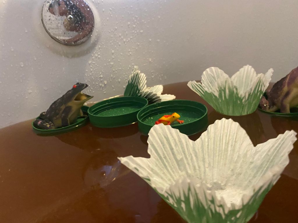 My kids recently played by a frog pond with Lilly pads and a real frog, that they tried unsuccessfully to catch. The next day we made our own frog pond in the tub.