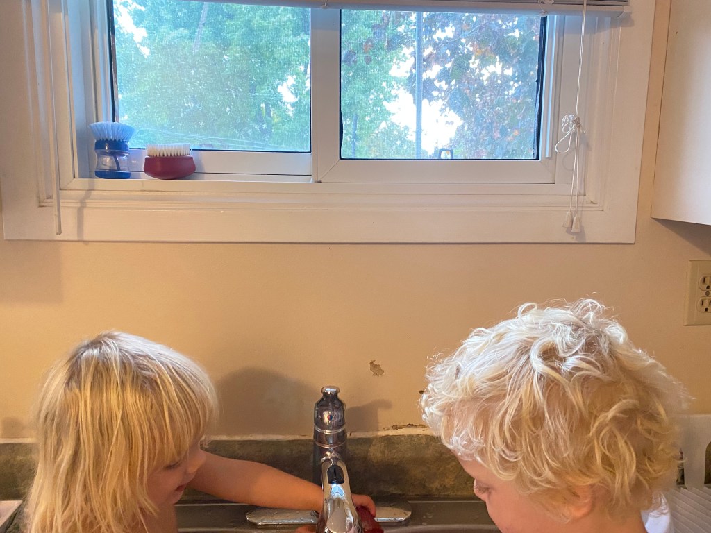 A sink bubble bath is perfect for keeping 1 – 2 kids busy in the kitchen. They love using the tap to rinse bubbles off their hands, and playing with kitchen tools that they normally don’t get to play with. It usually gives me enough time to unload and reload the dishwasher, sweep the floor, and wipe the counters. If only one kid is playing in the kitchen sink, I can often do dishes in the other sink. Sometimes I use sink baths as a reward for helping with dishes.