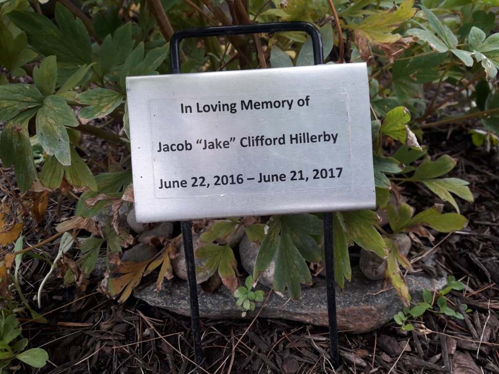 My parents originally planted a tree in their back yard and got a plaque of their own. They got comfort from sitting by it on Jake’s death anniversary. After they moved to a senior’s community, they arranged for a tree to be planted there. My dad put flowers there, on the most recent anniversary, and I know they visit it when they walk the dog. It’s nice for my parents to have something concrete that they can visit, since they live so far away from Jake’s grave.
