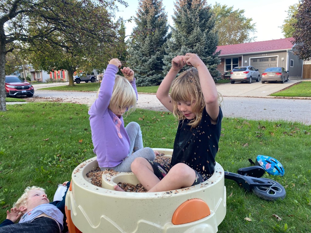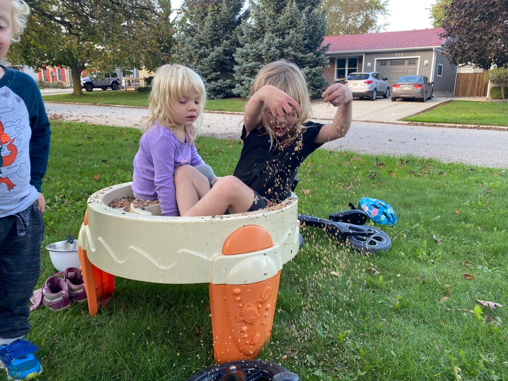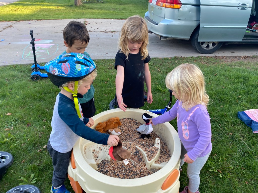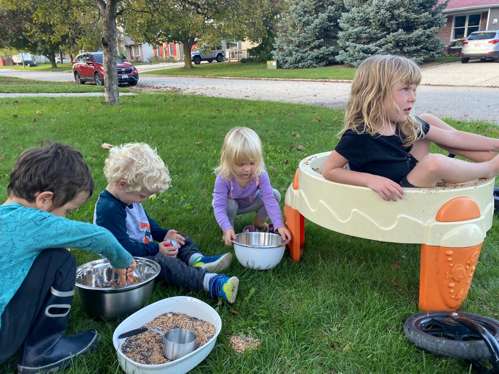 As I was sweeping up oats and lentils from my kitchen floor, I thought to myself, “Man, I need to do this outside next time so I don’t have to sweep. But then I’d have a bunch of oats and lentils outside, and they’d just sit, getting soggier and soggier each day.” Then I realized the solution: Bird Seed! So I went out and bought a giant bag of bird seed, threw it in my (dry) water table, and added some woodland creature stuffed animals and a few measuring cups… oh and some separate bowls when sharing got difficult.