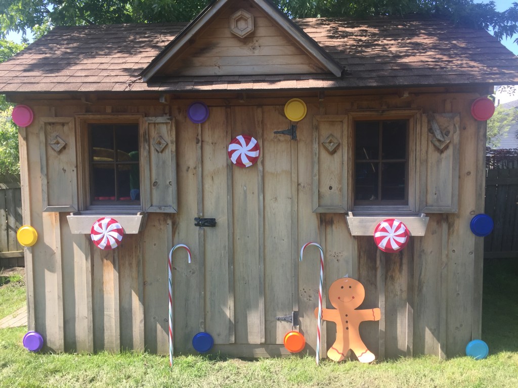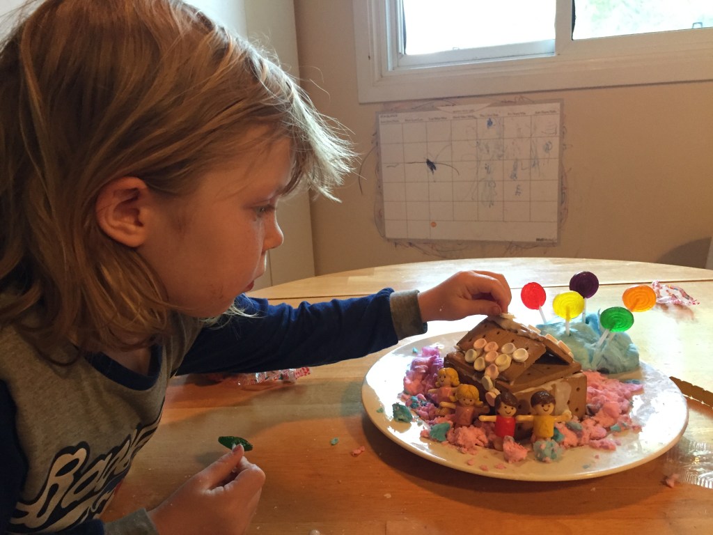 Just in case they hadn’t gotten enough candy from our yard, one year we also made a gingerbread house out of graham crackers. You can see little dolls representing all four children.