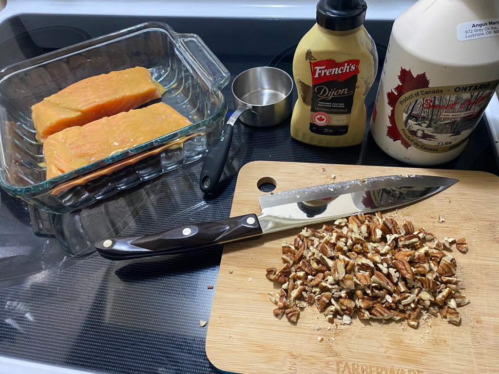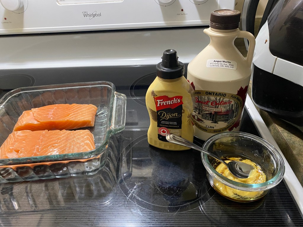 - Okay, back to business: Mix 1 tbsp maple syrup with 1 tbsp dijon mustard, while you tell that very helpful dog to stop trying to nose her way into the kitchen garbage.