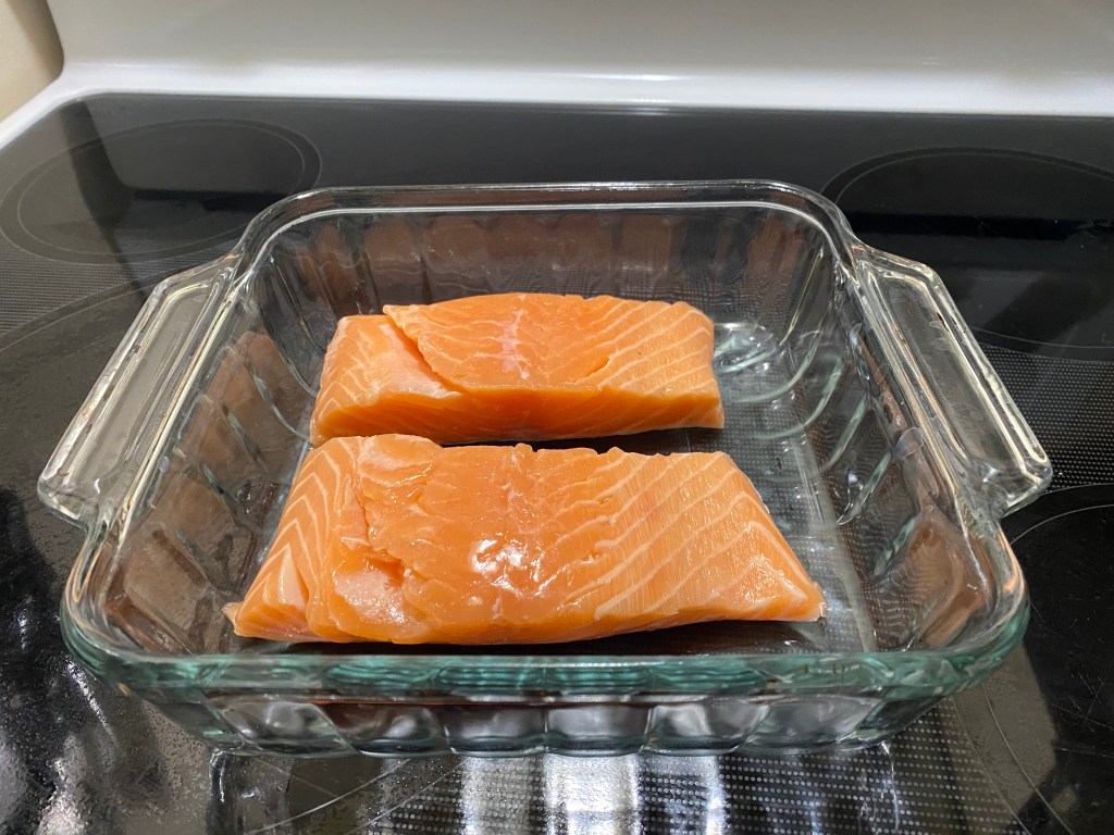 As your son asks you “What’s that?” and you explain that you can’t see his tablet when he’s on the floor and you’re at the counter, add one tablespoon each balsamic vinegar and extra virgin olive oil. Sprinkle with salt and pepper. Unless your pepper grinder is broken, and you keep forgetting to buy a new one. Then use just salt for months on end, but keep the pepper grinder beside it as a reminder of the life you used to have. Mix. Now put it in the oven as it heats up and move onto the salmon. It will take a few minutes longer for the asparagus to cook anyway.