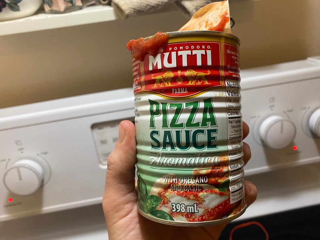 This is my very favourite pizza sauce. I get it from No Frills,. It’s non-GMO, and it just tastes amazing. I never thought the kind of pizza sauce would make much difference, but this one does.