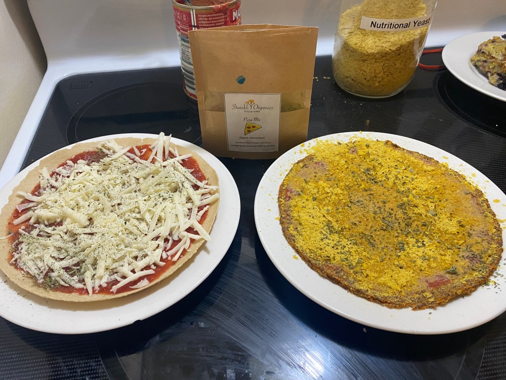 For a truly zero time meal and extra health boost, use nutritional yeast instead of cheese. Or grate some cheese. Or better yet, buy pre-grated cheese. Once you have spread your “cheese,” sprinkle pizza spice or oregano on top.