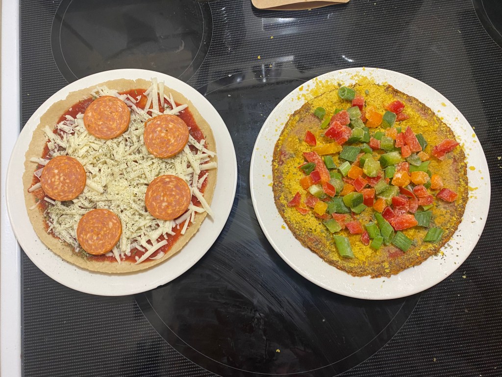 If for some reason you have extra time, feel free to add toppings. I used pre-sliced pepperoni and pre chopped frozen veges. Then put the plates with pizzas straight into the oven as it continues to warm.