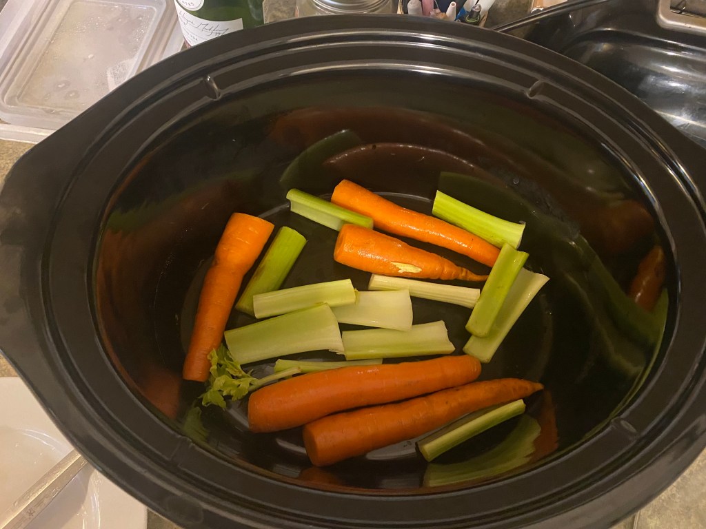 While your child yells, “Mom! Come see what I made!” And you yell, “Just bring it to me!” And your child yells, “I can’t bring it! It’s set up in my room! Just come see, it’s really good!” Rinse off some carrots and celery, cut the ends off, and throw them in your slow cooker. You can add chopped potatoes if you somehow have the time.