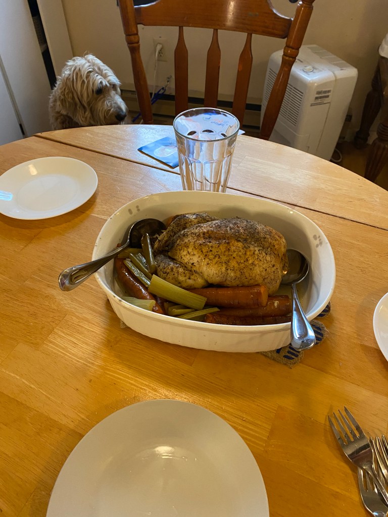 While your oldest kid yells that your youngest child went out front without asking, place the chicken on top of the vegetables. Feel free to sprinkle the top of the chicken with salt or poultry seasoning or whatever you have time for. But you actually don’t have time because it turns out your child was naked when she went out the front door. Now run and grab her.